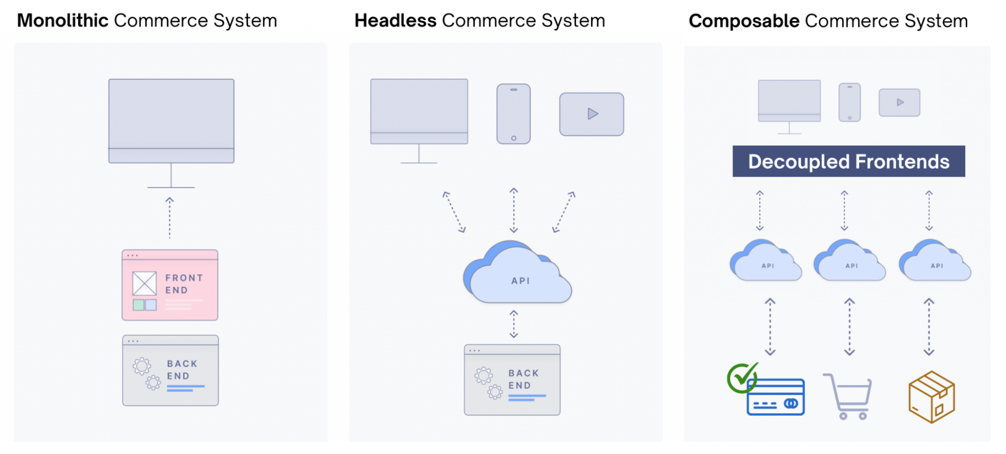 Headless commerce: The frontend and backend are separated, or “decoupled”. Backend systems share data and logic in a structured way via APIs, and each frontend channel can choose what information to use and how to present it.