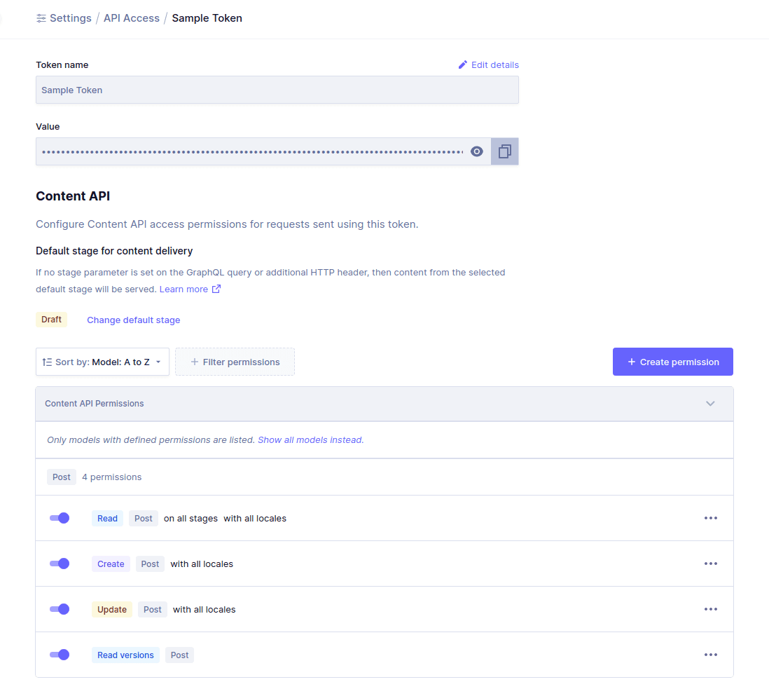 Create Permissiondialog, choose thePostmodel and theRead,CreateandUpdateactions keeping defaults forLocales,StagesandConditionand press theCreatebutton. - You can now use this sample token to access