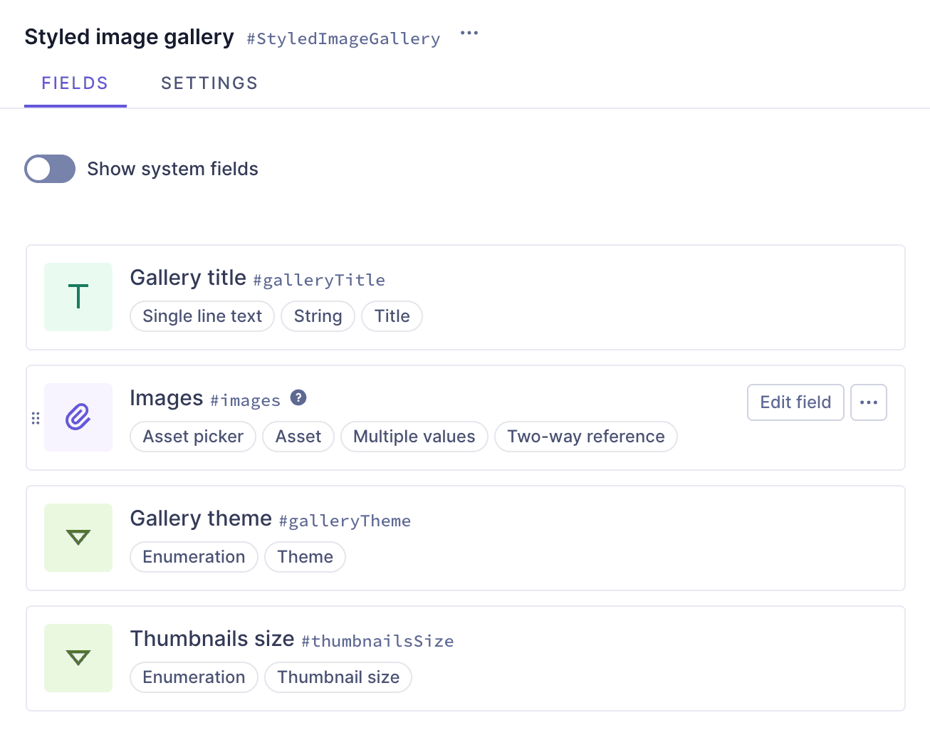 In the next step, we will create our image gallery component and include them as enumeration fields.